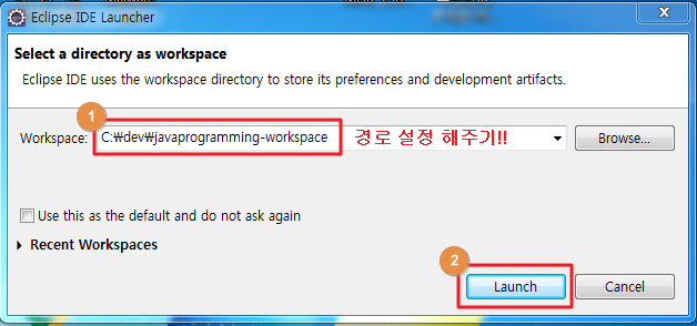 5. 작업공간의 경로를 지정 후 Launch를 클릭!!